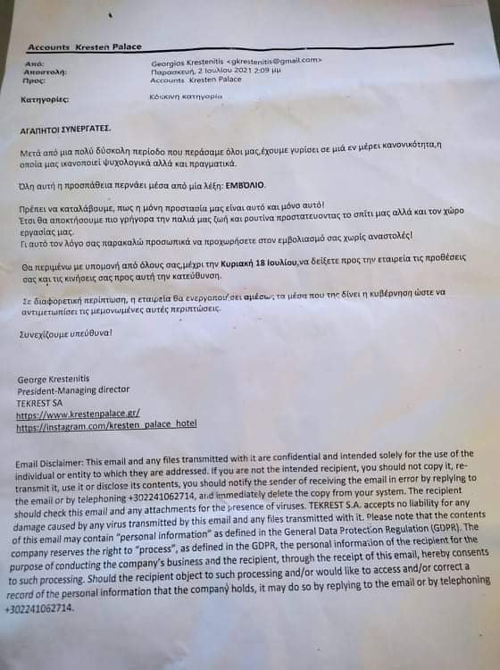 Το συγκεκριμένο διευθυντικό στέλεχος το οποίο υπογράφει το εσωτερικό έγγραφο προφανώς νομιμοποιείται -και το λέει- από τις κυβερνητικές επιλογές και τα εργαλεία που του πρόσφερε στο πιάτο ο υπουργός Οικονομίας Άδωνις Γεωργιάδης. Βασικό «εργαλείο» είναι το δικαίωμα απόλυσης εργαζόμενου αν και εφόσον δεν υπακούσει στις εντολές για εμβολιασμό.