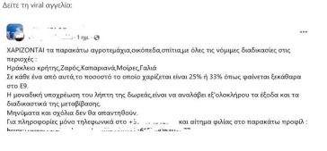 Viral έχει γίνει αγγελία που κυκλοφορεί στα μέσα κοινωνικής δικτύωσης, στην οποία ιδιοκτήτης ανακοινώνει τη δωρεά αγροτεμαχίων σε περιοχές του Ηρακλείου, συγκεκριμένα σε Ζαρό, Καπαριανά, Μοίρες και Γαλιά.