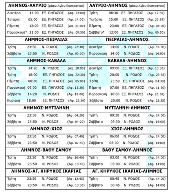 Το επιπλέον δρομολόγιο από Λαύριο θα εκτελείται κάθε Σάββατο στις 12.00 το μεσημέρι. Η διάρκειά του ταξιδιού θα φθάνει τις 13 ώρες περίπου, καθώς πριν από την άφιξη στον Άγιο Ευστράτιο και τη Λήμνο, το πλοίο θα προσεγγίζει τα Μεστά Χίου.