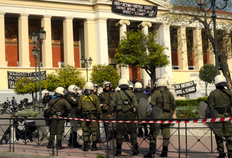 Η αστυνομική παρουσία ήταν έντονη γύρω από τον χώρο της Πρυτανείας, το κτήριο της οποίας τελεί υπό κατάληψη για 16η μέρα. Η Αστυνομία προχώρησε σε περισσότερες από 20 συλλήψεις, μεταξύ των οποίων ενός Πολωνού, που ήταν καταζητούμενος με διεθνές ένταλμα σύλληψης για υπόθεση ναρκωτικών και ενός Ισπανού.