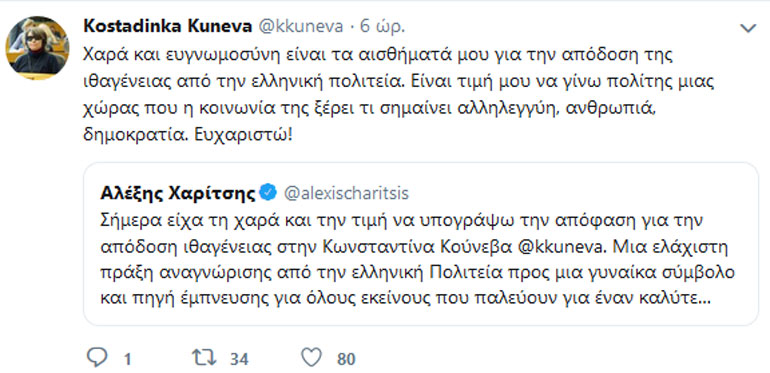 Την ελληνική ιθαγένεια έχει από την Παρασκευή η ευρωβουλευτής του ΣΥΡΙΖΑ, Κωνσταντίνα Κούνεβα. Ο υπουργός Εσωτερικών, Αλέξης Χαρίτσης, στο μήνυμά του μέσω Twitter τονίζει: