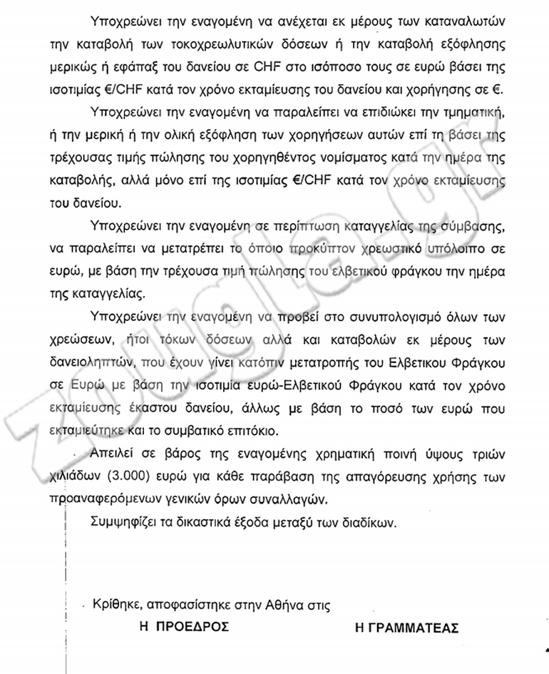 Ειδικότερα το διατακτικό της απόφασης, που εκδόθηκε στις 24/5, απαγορεύει στην τράπεζα να διατυπώνει, να επικαλείται και να χρησιμοποιεί στις συναλλαγές της με τους εν λόγω καταναλωτές τον γενικό όρο σύμφωνα με τον οποίο «η αποπληρωμή του δανείου λαμβάνει χώρα με την τρέχουσα τιμή πώλησης του νομίσματος την ημέρα της καταβολής» (αυτό αφορά συμβάσεις δανείων σε ελβετικό φράγκο ή με ρήτρα ελβετικού φράγκου). Επίσης, μεταξύ άλλων, απαγορεύει στην τράπεζα την καταγγελία των συμβάσεων των δανείων, εάν οι δανειολήπτες καταβάλλουν στο ισόποσό τους σε ευρώ τις τοκοχρεωλυτικές τους δόσεις σε CHF (ελβετικό φράγκο), βάσει της ισοτιμίας των δύο νομισμάτων «κατά τον χρόνο εκταμίευσης του δανείου και χορήγησης σε ευρώ».