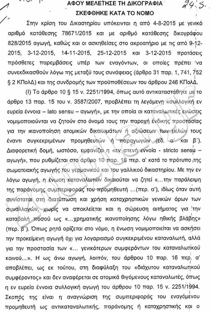 Απόφαση με την οποία δικαιώνει τους δανειολήπτες σε ελβετικό φράγκο, εξέδωσε το Πολυμελές Πρωτοδικείο Αθηνών, δεχόμενο το σκεπτικό της συλλογικής αγωγής που κατέθεσαν η Γενική Ομοσπονδία Καταναλωτών Ελλάδας (ΙΝΚΑ) και οι ενώσεις καταναλωτών Κρήτης (ΙΝΚΑ) και Αιτωλοακαρνανίας, με την πρόσθετη παρέμβαση του Συλλόγου Δανειοληπτών Ελβετικού Φράγκου (ΣΥΔΑΝΕΦ).