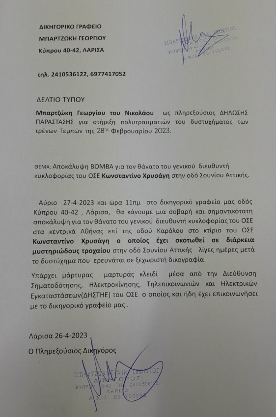 Νέες αποκαλύψεις για το δυστύχημα στα Τέμπη προαναγγέλλει ο δικηγόρος Λάρισας, Γιώργος Μπαρτζώκης με δελτίο τύπου το οποίο έστειλε στα Μέσα Μαζικής Ενημέρωσης.
