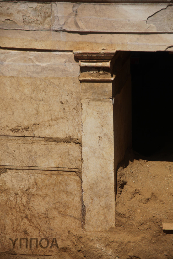 Εξαιρετικό ενδιαφέρον, επίσης, έχει το γεγονός ότι, σύμφωνα με τους αρχαιολόγους, «έχουν αρχίσει να αποκαλύπτονται και οι πλαϊνοί τοίχοι του προθαλάμου. Είναι επενδεδυμένοι με μάρμαρο Θάσου και κοσμούνται στο ανώτερο μέρος τους με ιωνικό επιστύλιο, επί του κυματίου του οποίου σώζονται ίχνη μαύρου και κόκκινου χρώματος».