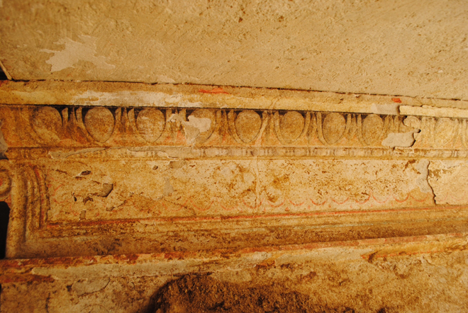 » Επί της νωπογραφίας των επιστυλίων της σώζονται ίχνη κόκκινου και μαύρου χρώματος. Η πλαϊνή και πίσω όψη των ιωνικών επικράνων των παραστάδων, που επικαλύπτονται από νωπογραφία, είναι επιζωγραφισμένες με τα ίδια χρώματα».