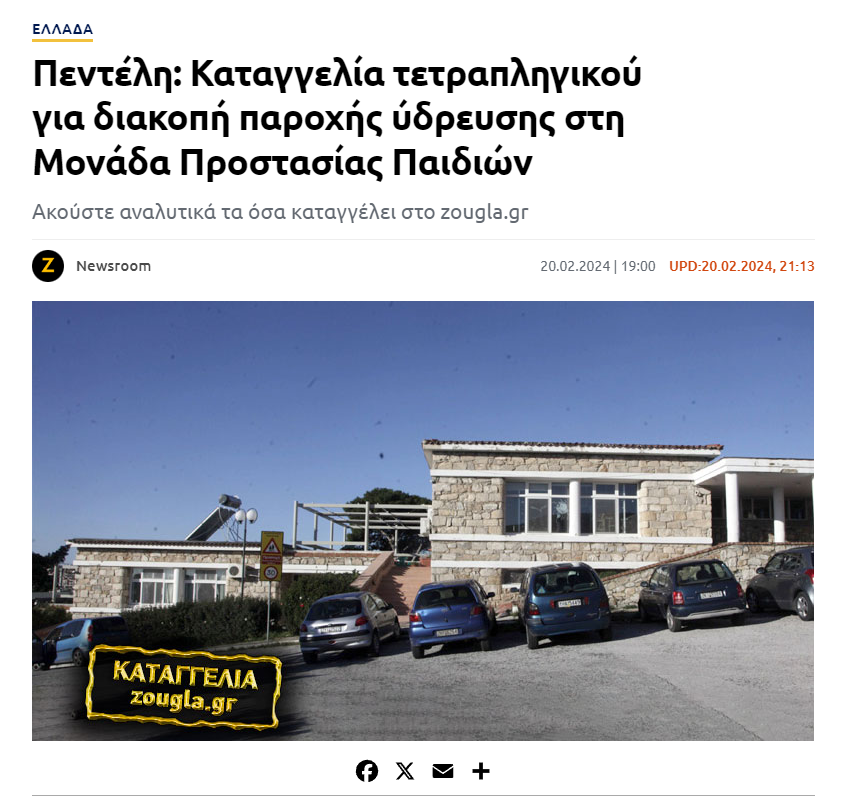Υπενθυμίζεται πως ο ίδιος νωρίτερα προέβει σε καταγγελία στη «Ζούγκλα» για την διακοπή παροχής ύδρευσης αλλά και την καθυστέρηση στην επιδιόρθωση της βλάβης αγωγού υδροδότησης – παρά τις συνεχείς εκκλήσεις – στις εγκαταστάσεις στον περιβάλλοντα χώρο της Μονάδας Προστασίας Παιδιών Πεντέλης (πρώην ΠΙΚΠΑ), με αποτέλεσμα ο κόσμος να παραμένει για ώρες χωρίς νερό.