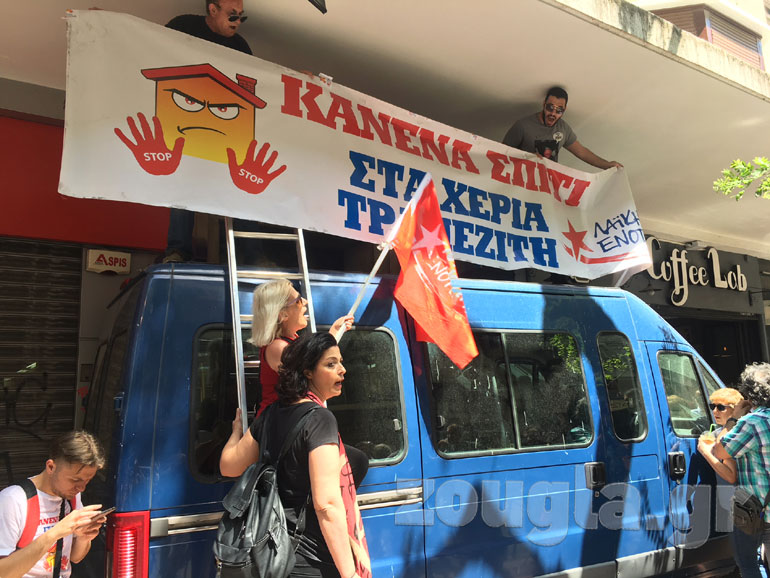 Ισχυρές δυνάμεις της αστυνομίας βρέθηκαν έξω από συμβολαιογραφείο στο κέντρο της Αθήνας όπου σήμερα, Τετάρτη, διεξήχθησαν ηλεκτρονικοί πλειστηριασμοί. Έξω από το κτήριο πραγματοποιήθηκε συγκέντρωση της Λαϊκής Ενότητας και άλλων κινημάτων κατά των πλειστηριασμών.