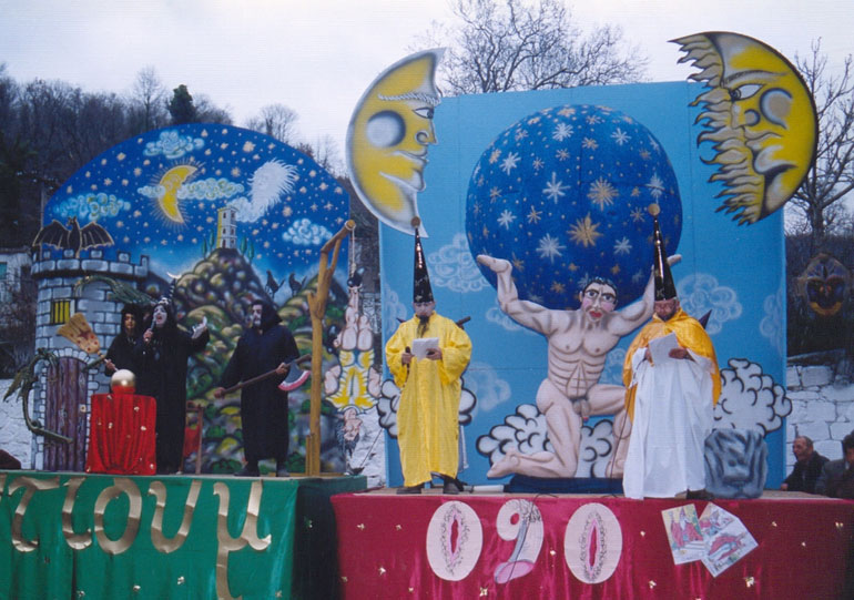 Όμιλος μουτσούνων, αφού περιδιαβεί τις γειτονιές του χωριού, θα καταλήξει στο χώρο των εκδηλώσεων όπου θα τραγουδήσει τα παραδοσιακά «τριψίματα» (δίστιχα ομοιοκαταληκτικά τραγούδια, που διασώζει μέσα στους αιώνες η προφορική λαϊκή παράδοση και τα οποία υμνούν τη σεξουαλική πράξη και τα γεννητικά όργανα)