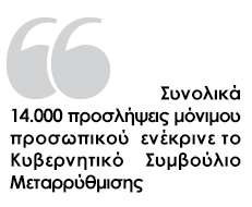 Μόνιμο προσωπικό πρόκειται να προσληφθεί στο Δημόσιο και συγκεκριμένα στα υπουργεία Οικονομικών, Υγείας, Εργασίας, Δημόσιας Τάξης και Εθνικής Άμυνας μέσα στο 2014. Οι προσλήψεις, που εγκρίθηκαν από το Κυβερνητικό Συμβούλιο Μεταρρύθμισης, αναμένεται να ξεπεράσουν τις 14.000 μέχρι και τις 31-12-2014.