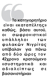Οι υπόλογοι υπάλληλοι -12 φύλακες, ένας αρχιφύλακας, ένας υπαρχιφύλακας κι ένας υπάλληλος εξωτερικής φρουράς-, όπως αναφέρεται, έριχναν ακόμη και νερό στον αλλοδαπό κρατούμενο, για να είναι πιο επώδυνα τα χτυπήματά τους.