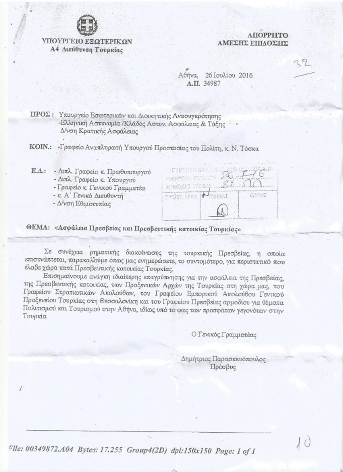 Η Τουρκική Πρεσβεία βρίσκεται στην καλύτερα φυλασσόμενη περιοχή των Αθηνών, αφού σε μικρή απόσταση, βρίσκεται το Μέγαρο Μαξίμου και η Προεδρική κατοικία. Ειδικότερα, μετά το πραξικόπημα στην Τουρκία, είχαν ληφθεί επιπλέον μέτρα φύλαξης. Μετά την παρέμβαση και από την στιγμή που δεν πραγματοποιήθηκε καμία σύλληψη (παρά μόνον προσαγωγές ασχέτων περαστικών), η Τουρκική Πρεσβεία ζήτησε επιτακτικά, λίγη ώρα μετά την παρέμβαση, μέσω κατεπείγοντος μηνύματος προς το Υπουργείο Εξωτερικών της Ελλάδας, τη δίωξη και τιμωρία των μελών μας.Συγκεκριμένα, το έγγραφο με ένδειξη «άκρως επείγον», αναφέρει: