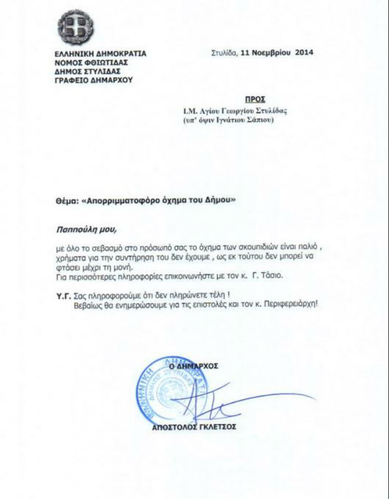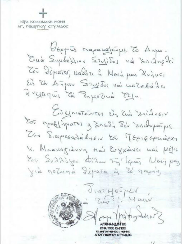 Σύμφωνα με το lamiastar.gr, o Αρχιμανδρίτης απέστειλε έγγραφο προς το Δημοτικό Συμβούλιο, ζητώντας να φτάνει μέχρι το μοναστήρι του το απορριμματοφόρο του Δήμου.