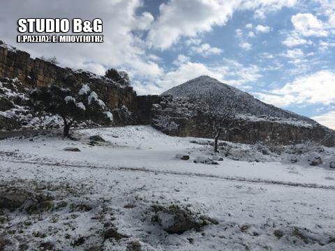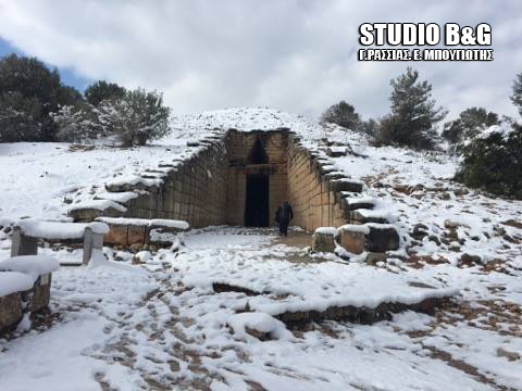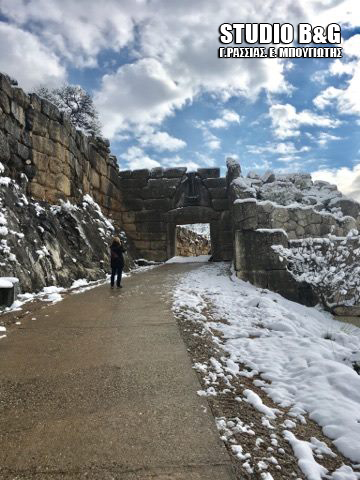 Όμορφες εικόνες κατέγραψε ο φωτογραφικός φακός από τον μυθικό τάφο του Ατρέα και την Πύλη των Λεόντων στην Ακρόπολη των Μυκηνών (Αργολίδα) που ντύθηκαν στα… λευκά λόγω της χιονόπτωσης.
