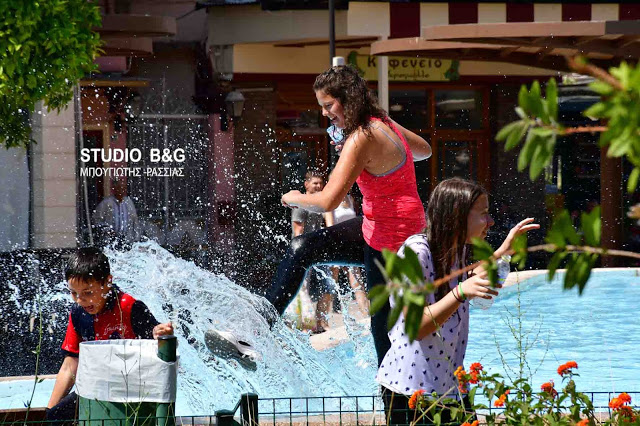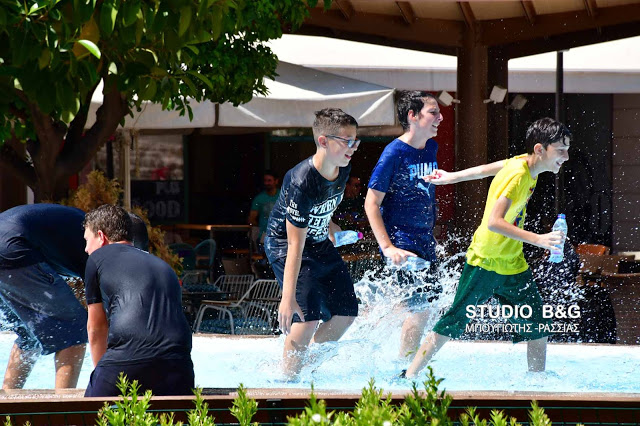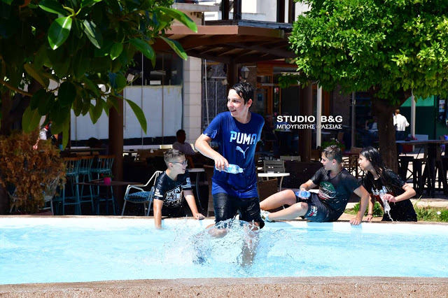 Στην τεχνητή λίμνη της ανάπλασης, στην πλατεία Αγίου Πέτρου στο Άργος, «γιόρτασαν» τη λήξη της διδακτικής χρονιάς μαθητές των γυμνασίων της πόλης με τα καθιερωμένα μπουγέλα.