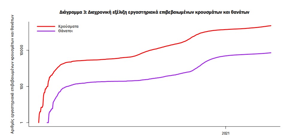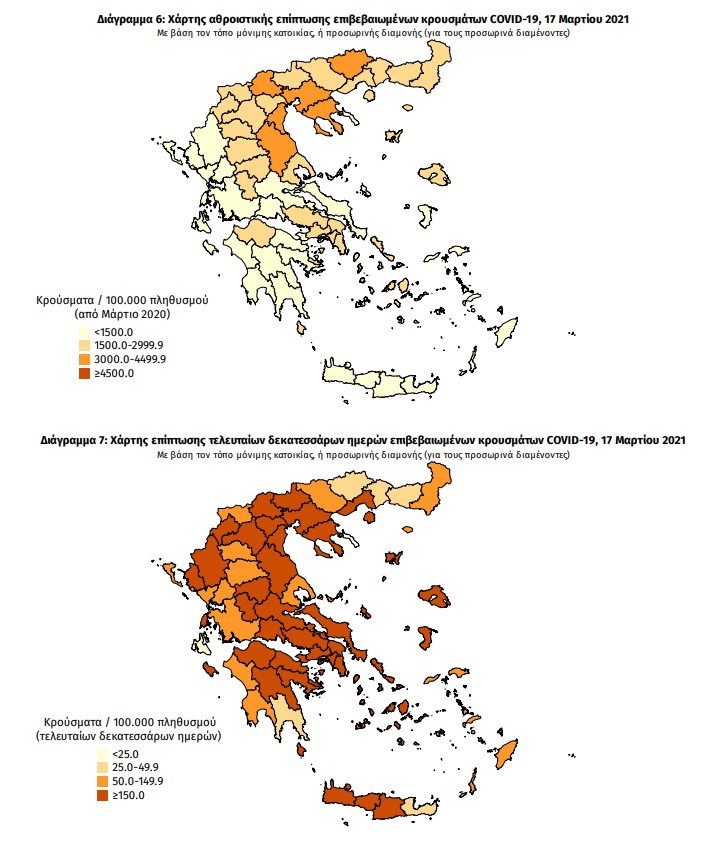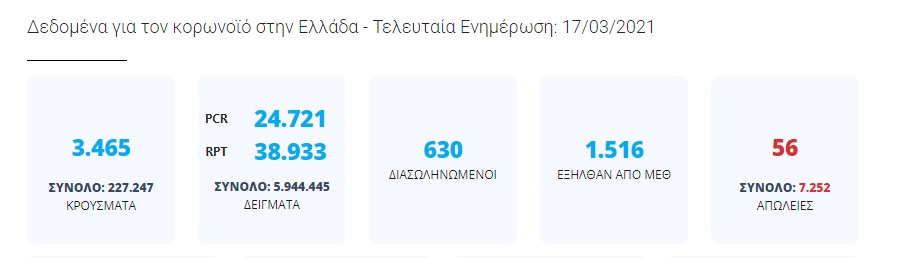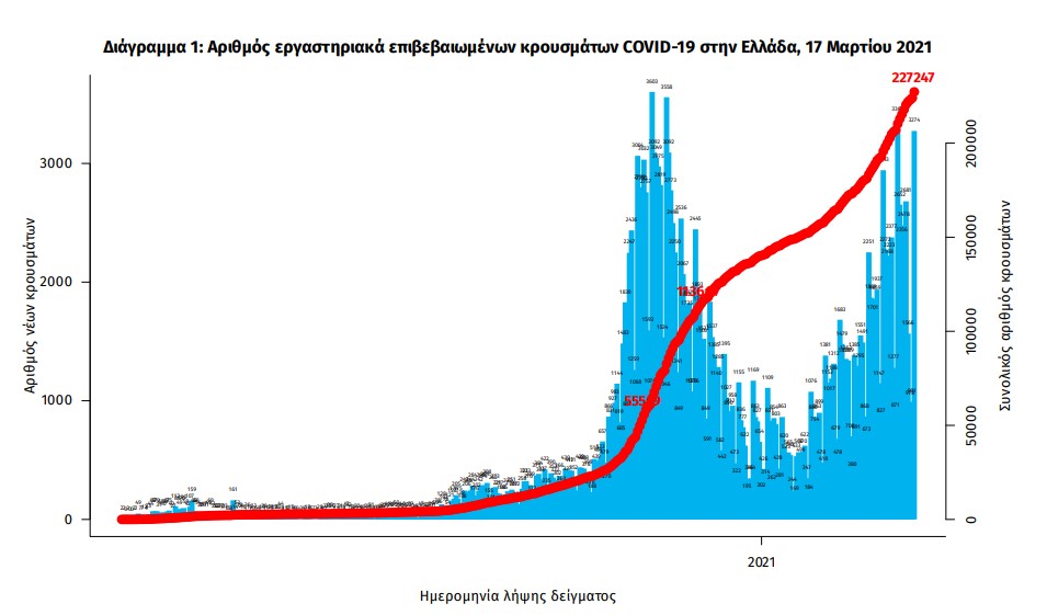 «Τα νέα εργαστηριακά επιβεβαιωμένα κρούσματα της νόσου που καταγράφηκαν τις τελευταίες 24 ώρες είναι 3.465, εκ των οποίων 12 εντοπίστηκαν κατόπιν ελέγχων στις πύλες εισόδου της χώρας. Ο συνολικός αριθμός των κρουσμάτων ανέρχεται σε 227.247 (ημερήσια μεταβολή +1.5%), εκ των οποίων 51.6% άνδρες. 1 Με βάση τα επιβεβαιωμένα κρούσματα των τελευταίων 7 ημερών, 75 θεωρούνται σχετιζόμενα με ταξίδι από το εξωτερικό και 1.966 είναι σχετιζόμενα με ήδη γνωστό κρούσμα. To για την επικράτεια εκτιμάται σε 1.10 (95%Crl: 0.40-1.63.