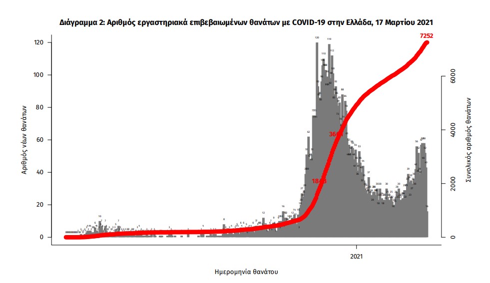 Οι νέοι θάνατοι ασθενών με COVID-19 είναι 56, ενώ από την έναρξη της επιδημίας έχουν καταγραφεί συνολικά 7.252 θάνατοι. Το 95.8% είχε υποκείμενο νόσημα ή/και ηλικία 70 ετών και άνω.