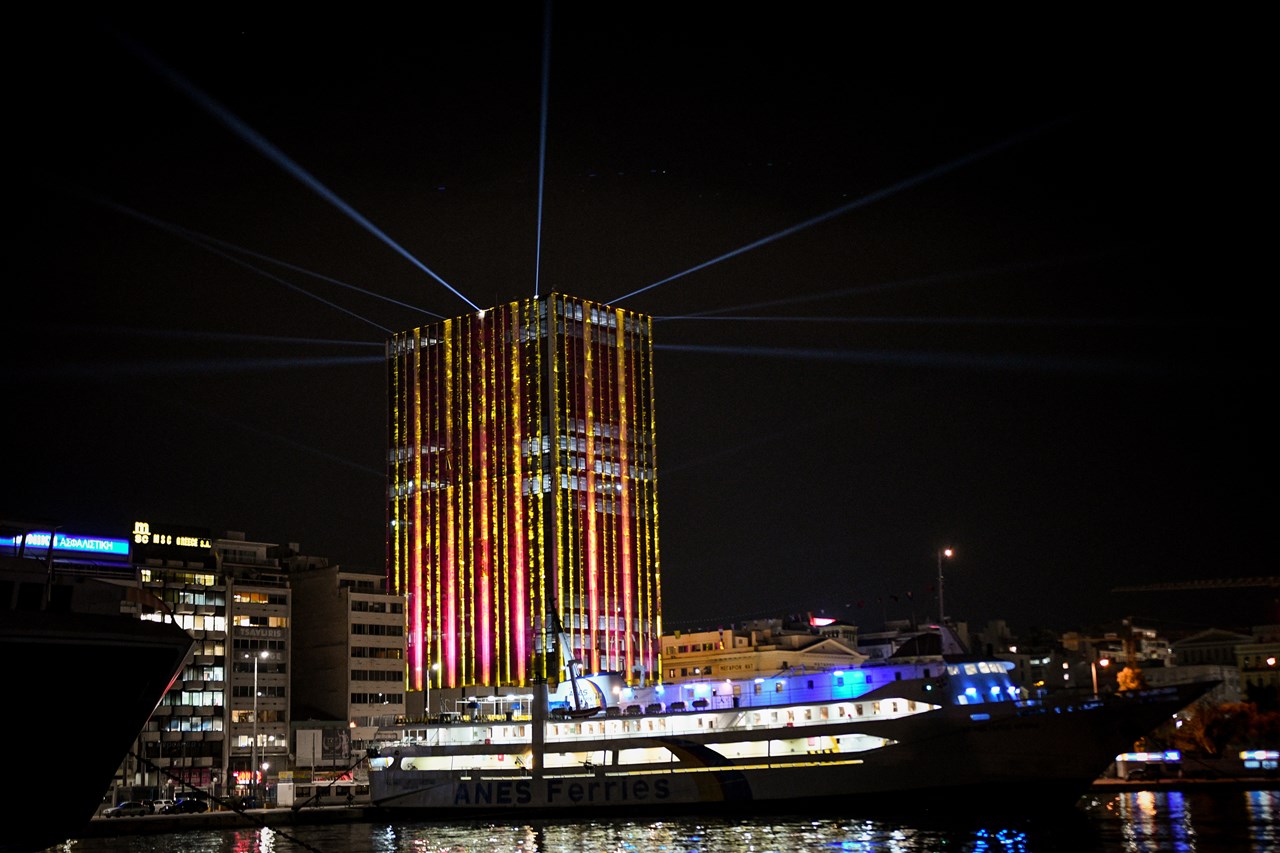 Σε γιορτινό κλίμα και ο Πειραιάς, όπου φωταγωγήθηκαν ο πύργος στο λιμάνι και το Δημοτικό θέατρο.