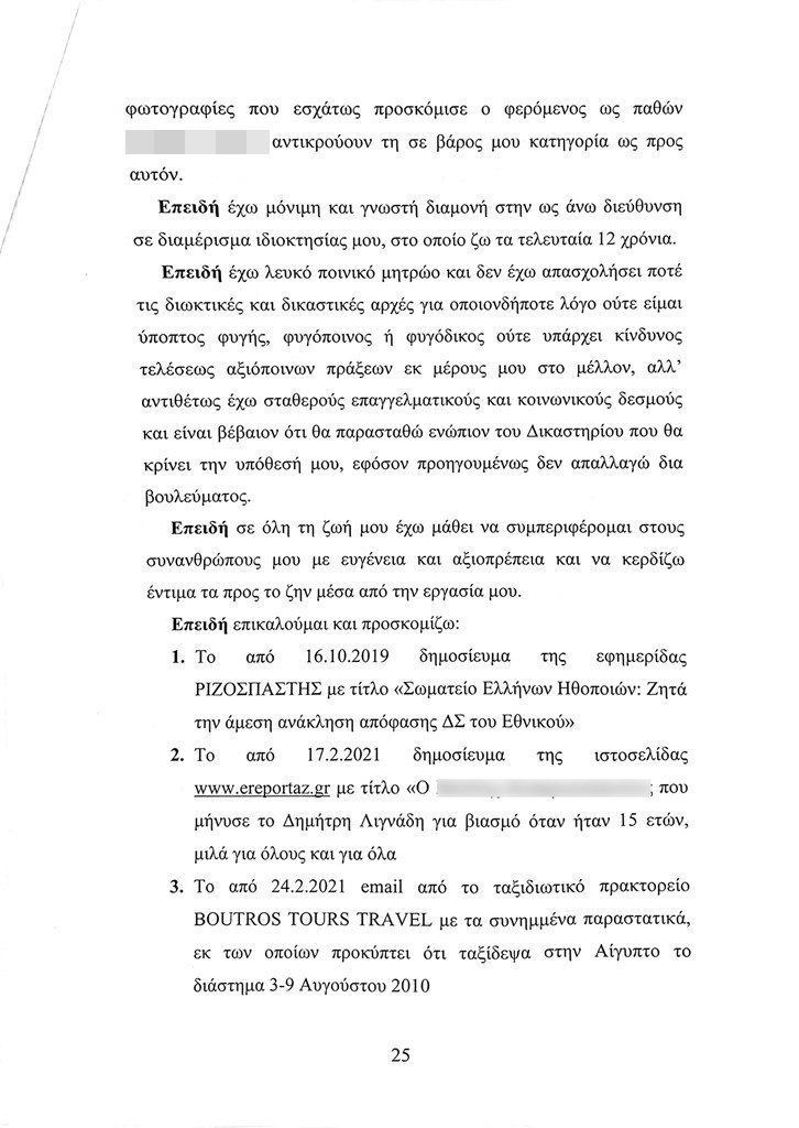 Και συνεχίζει: «Σχετικά με την αναφορά του μηνυτή και του μάρτυρα στο σπίτι μου και συγκεκριμένα στη θέα του σπιτιού μου στην Ακρόπολη και στον Λυκαβηττό, καθώς και στη γάτα, την οποία έχω, αυτά τα στοιχεία ναι μεν ανταποκρίνονται στην πραγματικότητα, καθώς πράγματι το σπίτι μου έχει θέα στην Ακρόπολη και πράγματι έχω μία γάτα, αλλά αυτά από μόνα τους δεν αποδεικνύουν ότι οι ως άνω έχουν έρθει στο σπίτι μου, διότι φωτογραφίες τόσο του σπιτιού μου με τη συγκεκριμένη θέα, όσο και της γάτας μου έχουν αναρτηθεί στο site spirishoot ήδη από το 2015 και έτσι ο καθένας θα μπορούσε να τα γνωρίζει χωρίς να έρθει ποτέ στο σπίτι μου».