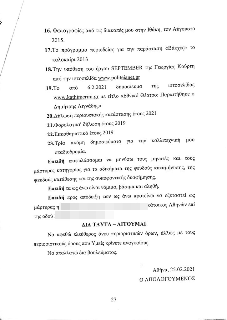 Αθώος δηλώνει ο Δημήτρης Λιγνάδης στο έκτασης 27 σελίδων απολογητικό υπόμνημα που κατέθεσε πριν από λίγο στην ανακρίτρια.