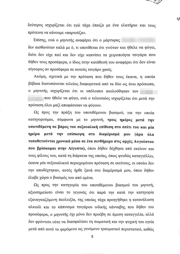 »Κορυφαία όμως απόδειξη του ψεύδους όλων των καταθέσεών του αποτελεί το γεγονός ότι, όπως αποδεικνύεται από τις καταθέσεις των μαρτύρων που έχω προτείνει και φωτογραφίες εκείνων των ημερών που προσκομίζω, από την 1η Αυγούστου 2015 μέχρι τέλη Αυγούστου 2015 βρισκόμουν συνεχώς στην Ιθάκη για διακοπές μαζί με τον αδερφό μου και την κόρη του».