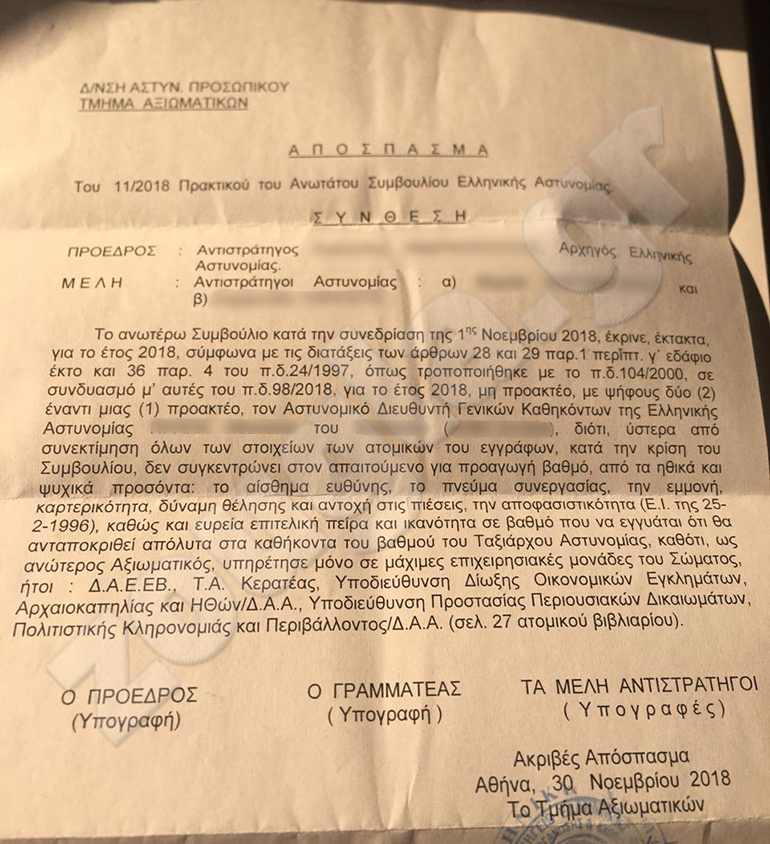 «Ο Αστυνομικός Διευθυντής (…) κατά την κρίση του Συμβουλίου δεν προάγεται διότι δεν διαθέτει τα… ψυχικά προσόντα, το αίσθημα ευθύνης, το πνεύμα συνεργασίας, την εμμονή, καρτερικότητα, δύναμη θέλησης και αντοχή στις πιέσεις, την αποφασιστικότητα καθώς και ευρεία επιτελική πείρα (…) σε βαθμό που εγγυάται ότι θα ανταποκριθεί απόλυτα στα καθήκοντα του Ταξιάρχου Αστυνομίας διότι…ως Ανώτερος αξιωματικός υπηρέτησε μόνο σε «Μάχιμες» Επιχειρησιακές Μονάδες του Σώματος»!
