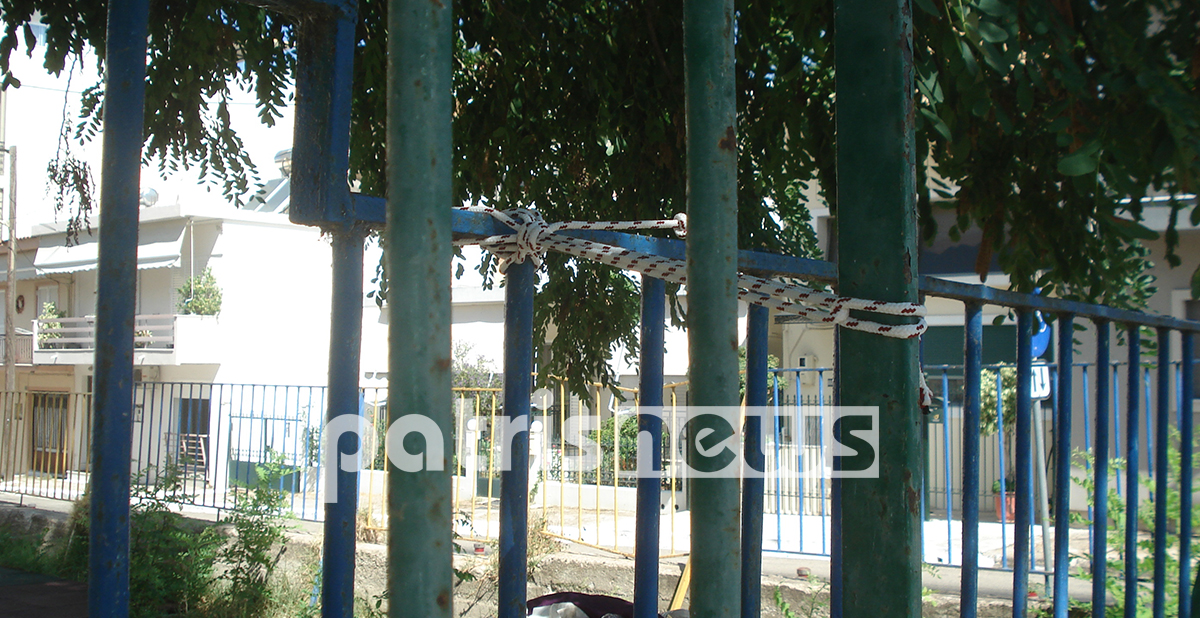 Βέβαια, το πρωί της Παρασκευής η πόρτα βρέθηκε και πάλι… στη θέση της, κομμένη και δεμένη με σκοινί και η παιδική χαρά… ορθάνοιχτη.