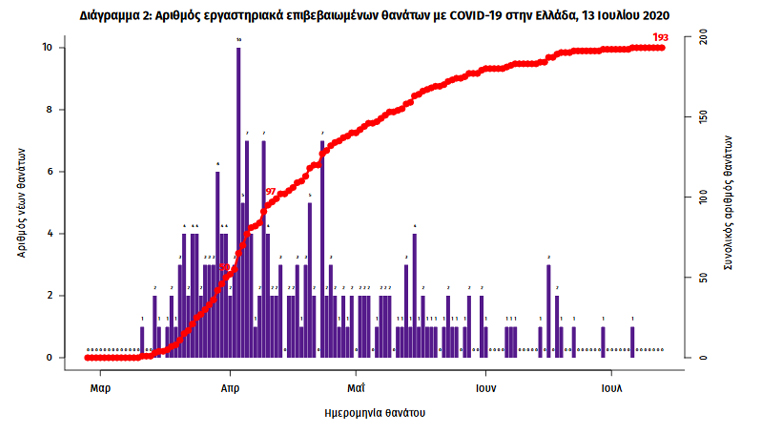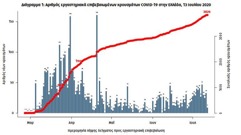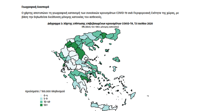 Τα στοιχεία που παρουσιάζονται αφορούν περιστατικά από την επιδημιολογική επιτήρηση της νόσου από το νέο κορωνοϊό (COVID-19), με βάση τα δεδομένα που έχουν δηλωθεί στον ΕΟΔΥ και καταγραφεί μέχρι τις 13 Ιουλίου 2020 (ώρα 15:00).