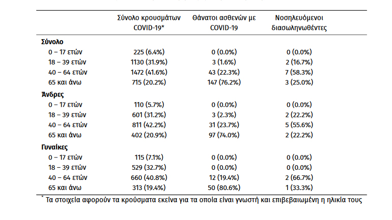 Από το σύνολο των 3826 κρουσμάτων, 1007 (26.3%) θεωρούνται σχετιζόμενα με ταξίδι από το εξωτερικό, 2002 (52.3%) είναι σχετιζόμενα με ήδη γνωστό κρούσμα και τα υπόλοιπα δεν σχετίζονται ούτε με ταξίδι ούτε με άλλο γνωστό κρούσμα ή είναι ακόμαυπό διερεύνηση. Η μέση ηλικία των κρουσμάτων είναι 47 έτη (εύρος 0 έως 102 ετών), ενώ η μέση ηλικία των θανάτων είναι 76 έτη (εύρος 35 έως 102 ετών). Η ηλικιακή κατανομή των (α) συνολικών κρουσμάτων, (β) των περιστατικών που κατέληξαν σε θάνατο και (γ) των ασθενών που νοσηλεύονται διασωληνωμένοι, είναι η ακόλουθη: