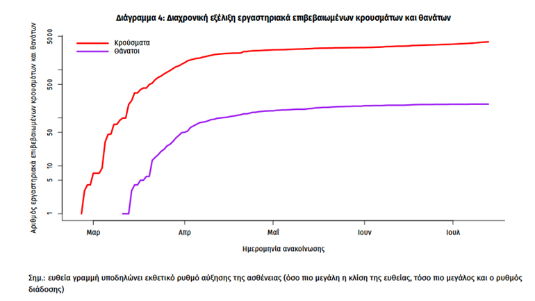 Η διαχρονική εξέλιξη των συνολικών κρουσμάτων και συνολικού αριθμού των θανάτων ασθενών COVID-19 παρουσιάζεται στο ακόλουθο διάγραμμα (σε λογαριθμική κλίμακα):