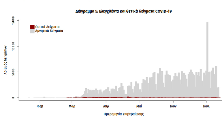 Από την 1η Ιανουαρίου 2020 μέχρι σήμερα, στα εργαστήρια που διενεργούν ελέγχους για τον νέο κορωνοϊό (SARS-CoV-2) και που δηλώνουν συστηματικά στον ΕΟΔΥ το σύνολο των δειγμάτων που ελέγχουν (θετικά και αρνητικά), έχουν συνολικά ελεγχθεί 382.452 κλινικά δείγματα, εκ των οποίων τα 5.993 (1.6%) ήταν θετικά στον κορωνοϊό (συμπεριλαμβάνονται και περισσότερα από ένα δείγματα ανά άτομο που ελέγχθηκε). Από το ανωτέρω σύνολο δειγμάτων, τα 41.550 (10.9%) αφορούν δειγματοληψίες σε εισερχόμενες αεροπορικές πτήσεις (από τις 12 Ιουνίου). Εξ’αυτών τα 85 (0.2%) θετικά στον κορωνοϊό.