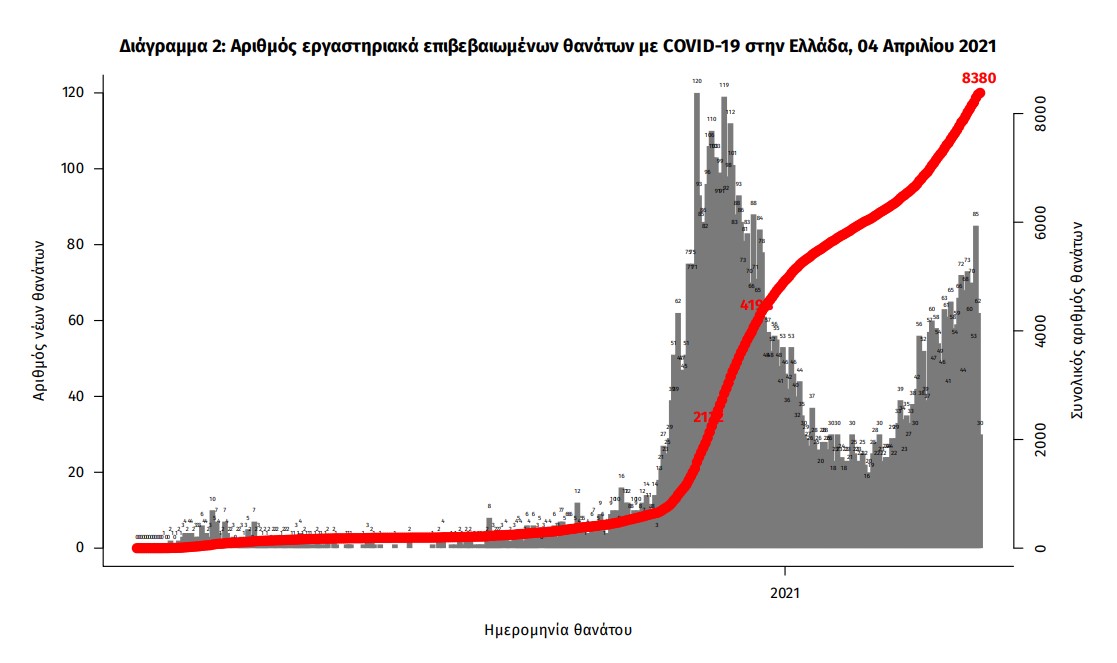 Οι νέοι θάνατοι ασθενών με COVID-19 είναι 78, ενώ από την έναρξη της επιδημίας έχουν καταγραφεί συνολικά 8.380 θάνατοι. Το 95.7% είχε υποκείμενο νόσημα ή/και ηλικία 70 ετών και άνω.