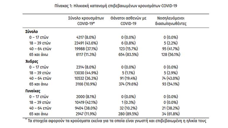 Η μέση ηλικία των κρουσμάτων είναι 39 έτη (εύρος 0 έως 103 ετών), ενώ η μέση ηλικία των θανάτων είναι 79 έτη (εύρος 25 έως 103ετών). Η ηλικιακή κατανομή των (α) συνολικών κρουσμάτων, (β) των περιστατικών που κατέληξαν σε θάνατο και (γ) των ασθενών που νοσηλεύονται διασωληνωμένοι, είναι η ακόλουθη: