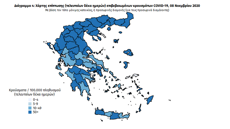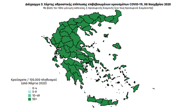 Ο χάρτης αποτυπώνει τη γεωγραφική κατανομή των συνολικών κρουσμάτων COVID-19 (από την αρχή της επιδημίας) ανά Περιφερειακή Ενότητα της χώρας, με βάση την δηλωθείσα διεύθυνση μόνιμης κατοικίας του ασθενούς, ή τη διεύθυνση προσωρινής διαμονής για τους τουρίστες και άλλους προσωρινά διαμένοντες στην Ελλάδα. Συμπεριλαμβάνονται τόσο κρούσματα με ιστορικό ταξιδίου (εισαγόμενα) όσο και κρούσματα με πιθανή εγχώρια μετάδοση.