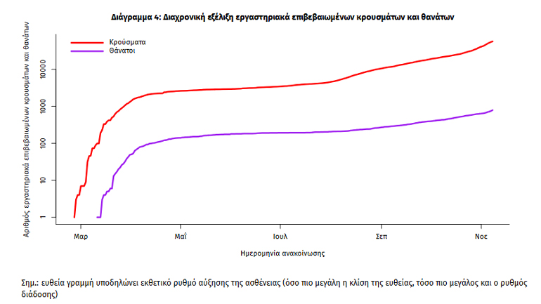 Η διαχρονική εξέλιξη των συνολικών κρουσμάτων και συνολικού αριθμού των θανάτων ασθενών COVID-19 παρουσιάζεται στο ακόλουθο διάγραμμα (σε λογαριθμική κλίμακα).