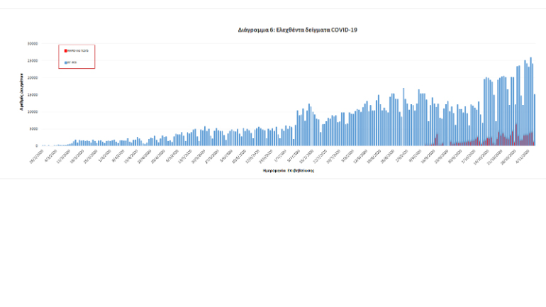 Από την 1η Ιανουαρίου 2020 μέχρι σήμερα, στα εργαστήρια που διενεργούν ελέγχους για τον νέο κορωνοϊό (SARS-CoV-2) και που δηλώνουν συστηματικά στον ΕΟΔΥ το σύνολο των δειγμάτων που ελέγχουν, έχουν συνολικά ελεγχθεί 1.941.656 κλινικά δείγματα ενώ από Μονάδες Υγείας και Κλιμάκια του ΕΟΔΥ που διενεργούν ελέγχους Rapid Ag έχουν ελεγχθεί 91.989 δείγματα