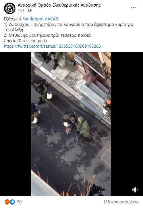 Όπως αναφέρεται στην ανάρτηση, «στην οδό Ζωοδόχου Πηγής, ένας αστυνομικός που ανήκει σε διμοιρία των ΜΑΤ καταστρέφει ένα μπουκέτο με λουλούδια» το οποίο φέρεται να το έχει αφήσει εκεί κάποια κυρία ή οποία – πάντα σύμφωνα με αυτούς που ανήρτησαν το βίντεο – ήθελε να πλησιάσει στο σημείο της δολοφονίας του Αλέξανδρου Γρηγορόπουλου. Στη συνέχεια, όπως φαίνεται στο βίντεο, ο αστυνομικός καταστρέφει το μπουκέτο με τα λουλούδια.