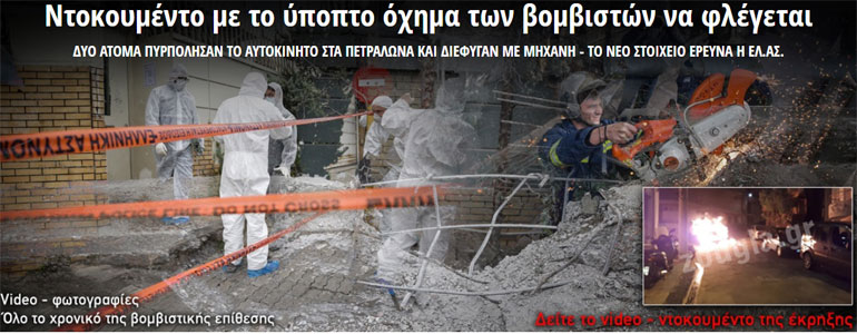 Η βόμβα ήταν μέσα σε σακίδιο πλάτης και οι δράστες τη στερέωσαν στο προστατευτικό κιγκλίδωμα. Επιπλέον, ενισχύονται οι υποψίες ότι το καμένο Opel που εντοπίστηκε στα Άνω Πετράλωνα, είναι αυτό με το οποίο οι βομβιστές προσέγγισαν και διέφυγαν από το σημείο της επίθεσης. Το αυτοκίνητο βρίσκεται ήδη στα εγκληματολογικά εργαστήρια της ΕΛ.ΑΣ. για έρευνα.
