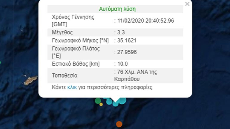 Δονήσεις μεγέθους 3,3 και 3,3 βαθμών της κλίμακας Ρίχτερ σημειώθηκαν σε χρονικό διάστημα μερικών δευτερολέπτων στα ανοιχτά της Καρπάθου το βράδυ της Τρίτης, περίπου στις 22:40, σύμφωνα με το Γεωδυναμικό Ινστιτούτο του Εθνικού Αστεροσκοπείου Αθηνών.