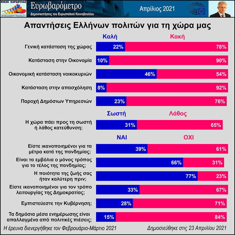 Αντίθετα με τα συμπεράσματα στα οποία καταλήγουν οι δημοσκοπήσεις των ελληνικών εταιρειών ανίχνευσης της κοινής γνώμης είναι ποσοστά επί των απαντήσεων των Ελλήνων πολιτών που δημοσιεύονται από το Ευρωβαρόμετρο και αφορούν τον τρόπο με τον οποίο οι πολίτες αυτής της χώρας αντιλαμβάνονται την πανδημία, τον τρόπο διαχείρισής της από την κυβέρνηση, αλλά και τον τρόπο και τα μέσα καταπολέμησης του Covid-19.