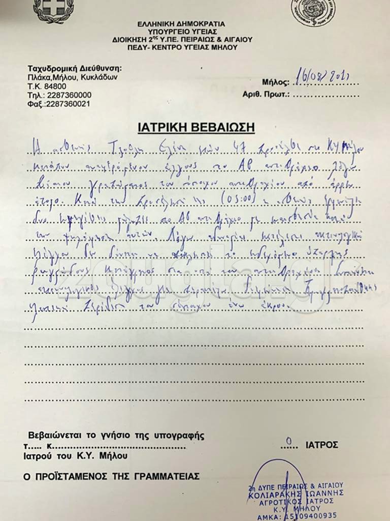 Δύο λιμενικοί διακόμισαν την κυρία Τζούλη στο Ιατρικό Κέντρο Μήλου όπου εξετάστηκε και της χορηγήθηκε ιατρική βεβαίωση, πιστοποιώντας μεγάλους και εκτεταμένους μώλωπες σε ολόκληρο τον αριστερό της βραχίονα, ενώ η ίδια ζήτησε και τη διενέργεια ιατροδικαστικής εξέτασης.