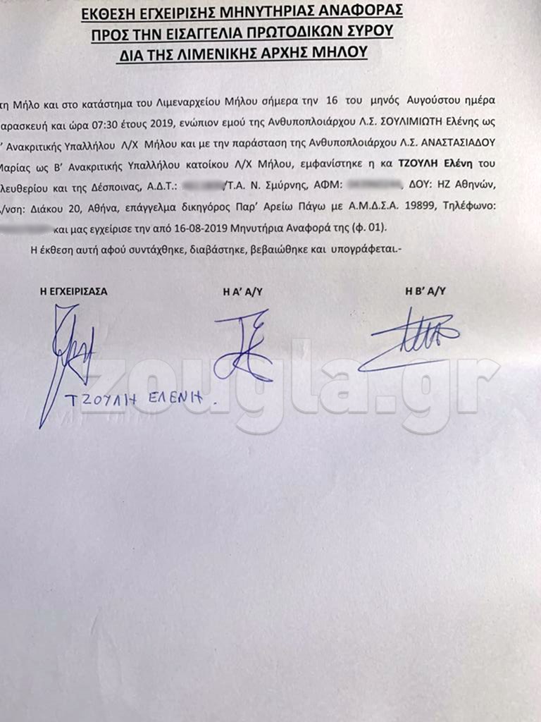 Έπειτα από το ρεπορτάζ του zougla.gr σχετικά με το σοβαρό επεισόδιο που σημειώθηκε στο λιμάνι του Αδάμαντα της Μήλου με την επίθεση με γιαούρτια ανθρώπων του περιβάλλοντος του Βαγγέλη Μαρινάκη στο σκάφος του Πάνου Καμμένου, και τον τραυματισμό της συζύγου του Έλενας Τζούλη, άνθρωποι από το περιβάλλον της επικοινώνησαν με το zougla.gr και μας μετέφεραν τα γεγονότα.