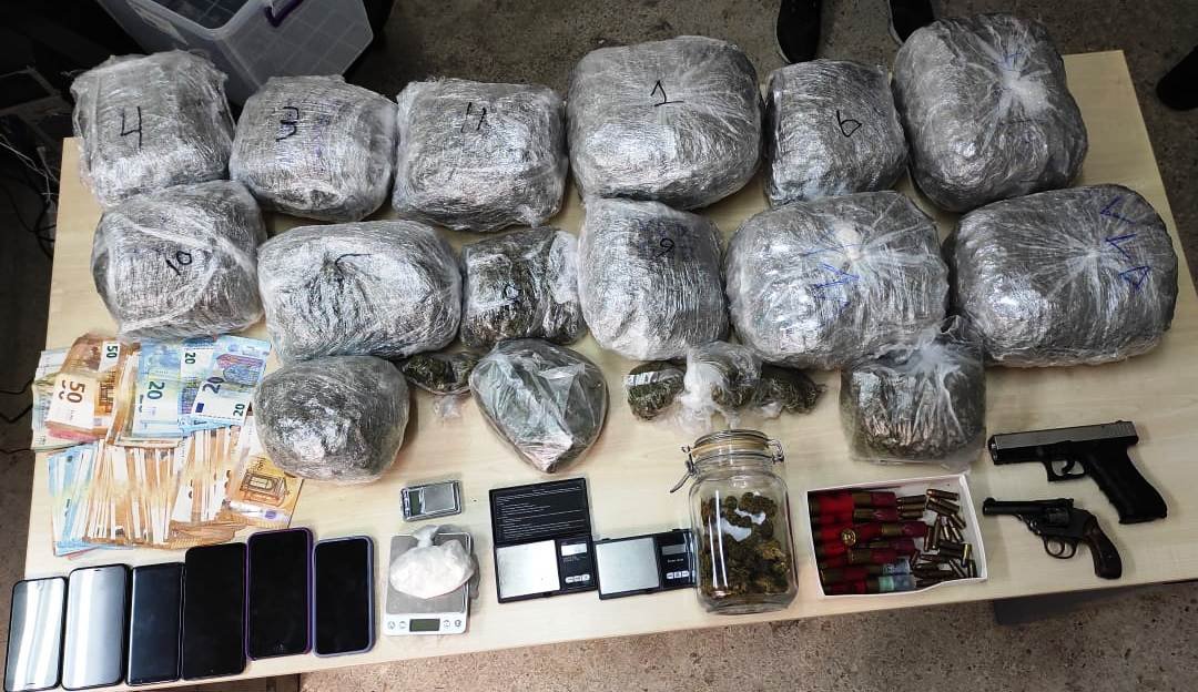 Από τις έρευνες που πραγματοποιήθηκαν, με τη συνδρομή αστυνομικών Ομάδων Πρόληψης και Καταστολής Εγκληματικότητας, στις οικίες των μελών του κυκλώματος βρέθηκαν και κατασχέθηκαν συνολικά: Περισσότερα από 10 κιλά κάνναβη, 172 γραμμάρια κοκαΐνης, 7 ζυγαριές ακριβείας, περίστροφο και πιστόλι κρότου, 39.060 ευρώ, 5 οχήματα, 6 μοτοσικλέτες και 36 κινητά τηλέφωνα.