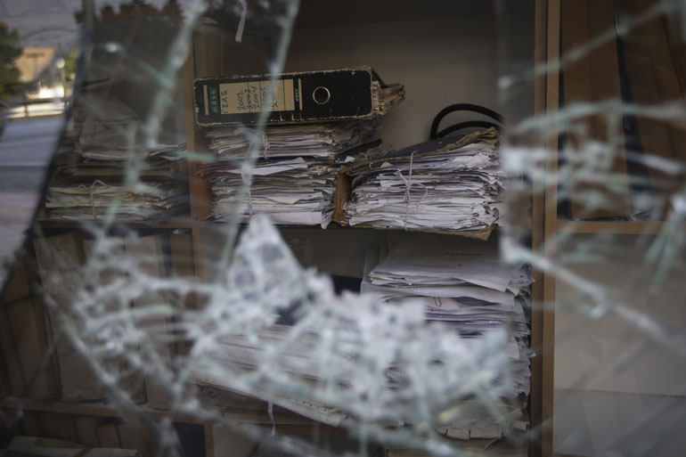 Με τις βαριοπούλες, έκαναν γυαλιά καρφιά τις τζαμαρίες του κτιρίου και αποχώρησαν.
