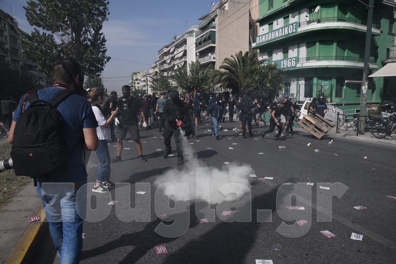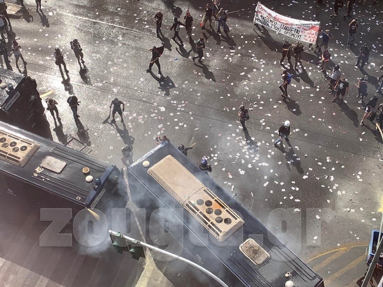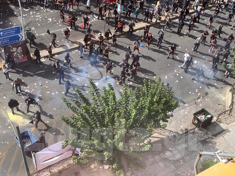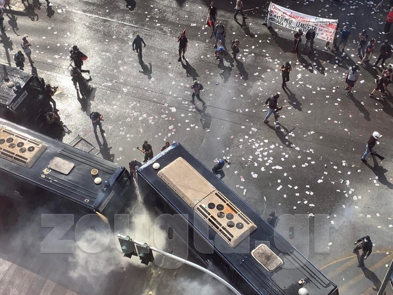«Στις 11.55 ώρα, περίπου 10 λεπτά μετά την ανακοίνωση της απόφασης του Εφετείου Αθηνών, και ενώ η πολυπληθής – 20.000 άτομα τουλάχιστον – συγκέντρωση διαλυόταν, αστυνομικές δυνάμεις δέχθηκαν επίθεση με μολότοφ, πέτρες και άλλα αντικείμενα από περίπου 600 άτομα, στη συμβολή των οδών Κ. Λουκάρεως και Λ. Αλεξάνδρας.