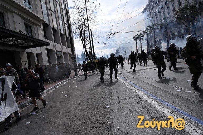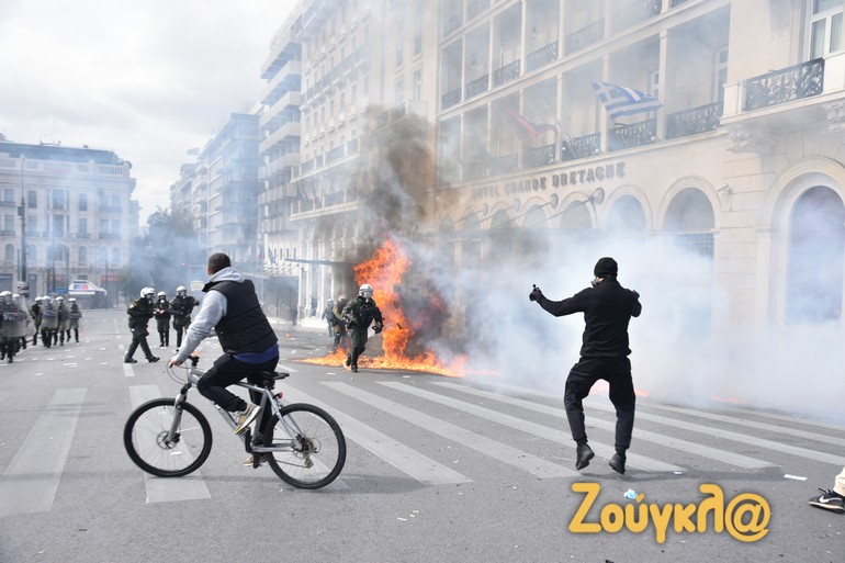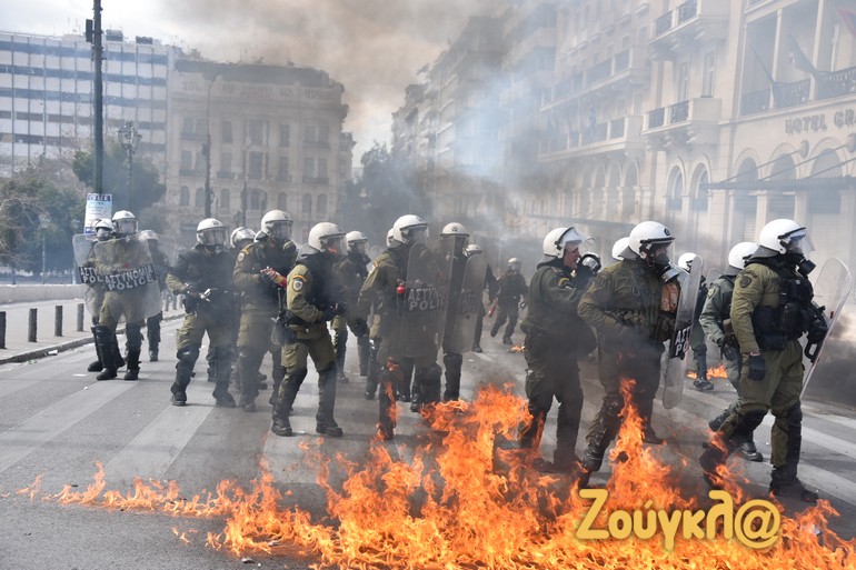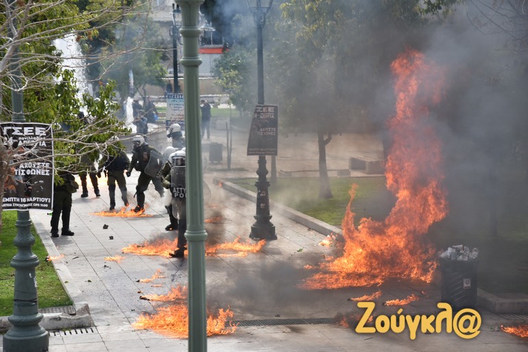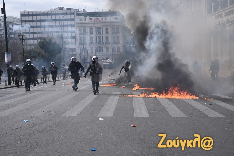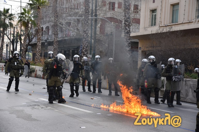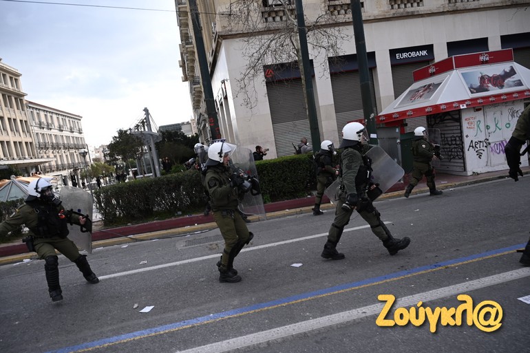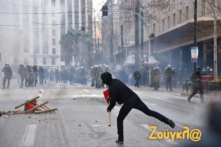 Γύρω στις 13:15 το μεσημέρι της Πέμπτης και μετά το πέρας της μαζικής διαδήλωσης στο κέντρο της Αθήνας, νεαροί διαδηλωτές έριξαν βόμβες μολότοφ κατά αστυνομικών. Οι άνδρες των ΜΑΤ αντέδρασαν άμεσα με τη ρίψη χημικών και χειροβομβίδων κρότου λάμψης.