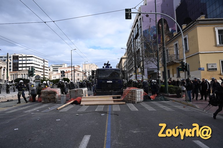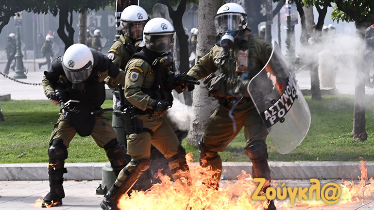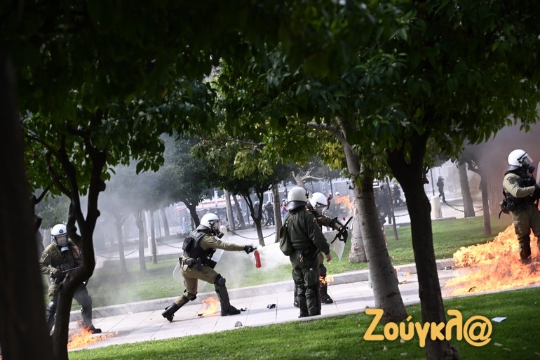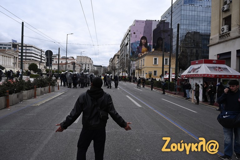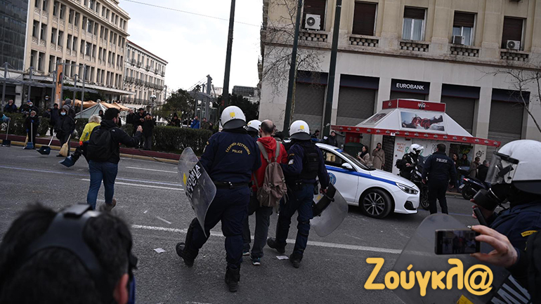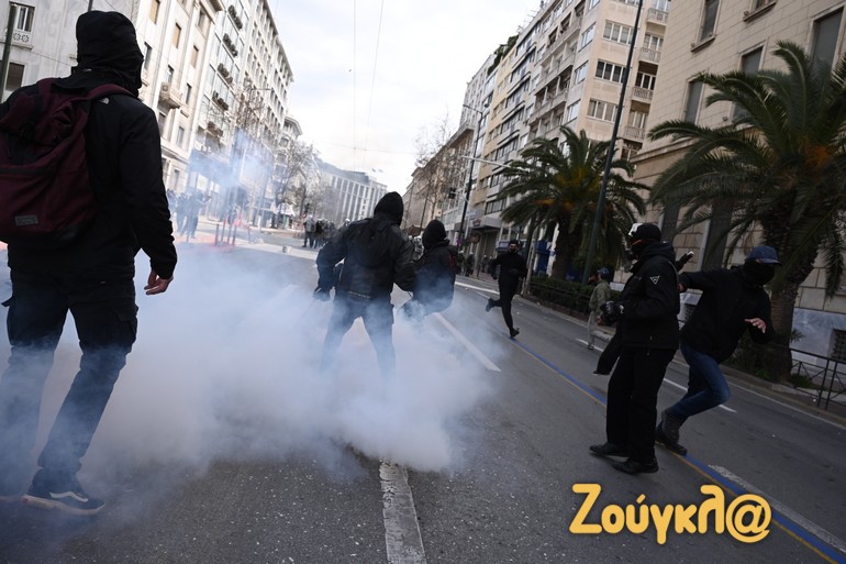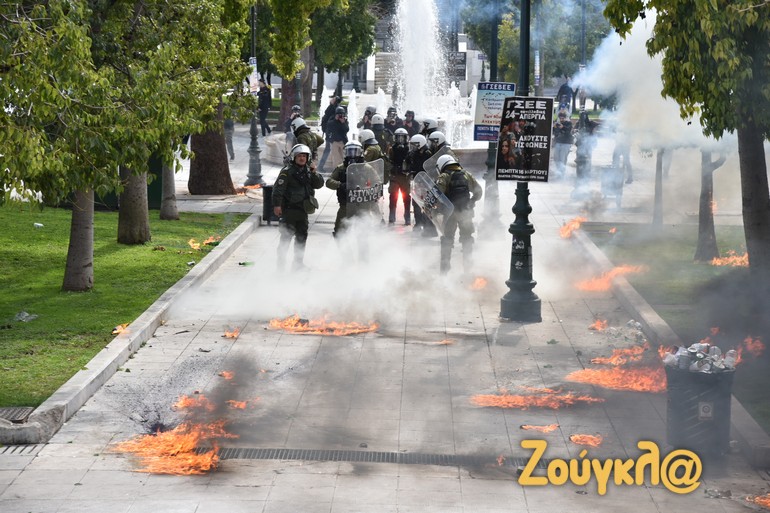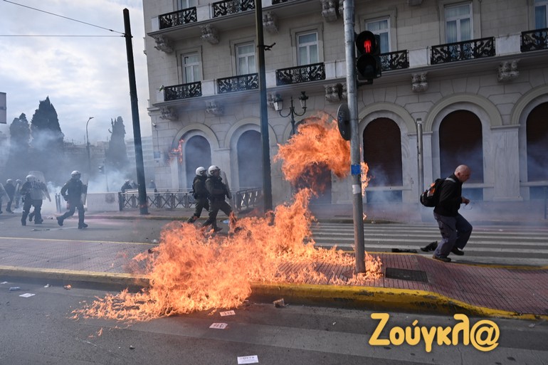 Γύρω στις 13:15 το μεσημέρι της Πέμπτης και μετά το πέρας της μαζικής διαδήλωσης στο κέντρο της Αθήνας, νεαροί διαδηλωτές έριξαν βόμβες μολότοφ κατά αστυνομικών. Οι άνδρες των ΜΑΤ αντέδρασαν άμεσα με τη ρίψη χημικών και χειροβομβίδων κρότου λάμψης.