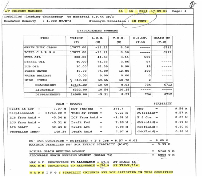 Αμέσως πιο κάτω παραθέτω τον από 16-11-2001 .(Σχ.17, Σελ. 2), έντυπο επικίνδυνο υπολογισμό ευστάθειας και διαμήκους αντοχής του πλοίου, τον οποίο απέστειλε ο αρχιπλοίαρχος Γρίβας Παναγιώτης στον πλοίαρχο Πετρολέκα Παναγιώτη με εντολή να φορτώσει το πλοίου σύμφωνα με αυτόν. Επιπρόσθετα αντίγραφο του ιδίου επικίνδυνου υπολογισμού ευστάθειας και διαμήκους αντοχής του πλοίου με ημερομηνία εκτύπωσης 16-11-2001 είχε επιδώσει ο αρχιπλοίαρχος Γρίβας Παναγιώτης σ’ εμένα, ως εν δυνάμει πλοίαρχος που ήμουν και ήταν υποχρεωμένος να με ενημερώσει για την πραγματική κατάσταση του πλοίου που πήγαινα να συναντήσω αεροπορικώς στο Μόντρεαλ του Καναδά. Παραθέτω φωτογ. αποσπά, της από 16-11-2001 επικίνδυνης φόρτωσης του Γρίβα.