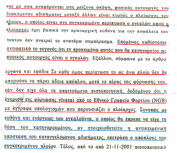 Οι δύο αυτές κυρίες, η 2α ανακρίτρια Αθηνών κ. Βιοπούλου Ιωσηφίνα και η εισαγγελέας Αθηνών κ. Κοντογιάννη Κωνσταντίνα, προσποιούνται ότι δήθεν αγνοούν την ύπαρξη της από 26-03-2009 (Σχ. 21) επιστολής του πλοιάρχου Πετρολέκα Παναγιώτη, βάσει της οποίας, ο ίδιος αναλαμβάνει πλήρως την ευθύνη ότι, αυτός ο ίδιος ύστερα από πιέσεις τις οποίες δέχτηκε από τον αρχιπλοίαρχο Γρίβα Παναγιώτη μέσω της έντυπης και (μερικώς) ιδιόχειρα γραμμένης από αυτόν τον ίδιο τον αρχιπλοίαρχο Γρίβα Παναγιώτη, βάσει της οποίας έδινε την εντολή στον πλοίαρχο Πετρολέκα Παναγιώτη να φορτώσει το πλοίο σύμφωνα με την επικίνδυνη αυτήν φόρτωση με ημερομηνία εκτύπωσης 21-11-2001, (Σχ. 17, σελ. 2) η οποία συμφωνεί απόλυτα, ότι, το πλοίο ‘’Ταξιδευτής’’, φορτώθηκε από τον ίδιο στα τρία (3) μεσαία αμπάρια του πλοίου, όπως ακριβώς βεβαιώνει και το ‘’Πιστοποιητικού ετοιμότητας (Σχ. 32), το οποίο είναι υπογεγραμμένο από τον ίδιο τον επιθεωρητή στο λιμάνι φόρτωσης του πλοίου ‘’Ταξιδευτής’’ Ντουλούθ, κ. Sencer Under και είναι υπογεγραμμένο και μεταφρασμένο από τον ίδιο τον δικηγόρο του εφοπλιστή Σταυρινίδη, Αβραάμ Πασιπουλαρίδη, ο οποίος το κατέθεσε προσωπικά στο Πρωτοδικείο Αθηνών, όπου φέρει και την σφραγίδα του Πρωτοδικείου.