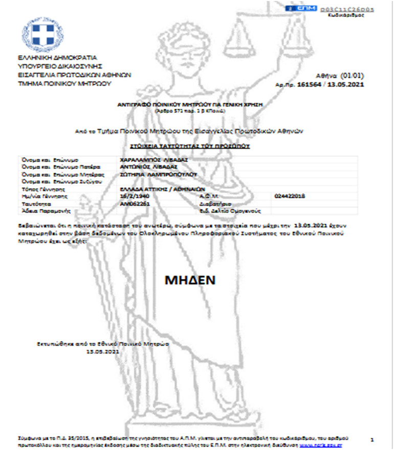 Κύριε εισαγγελέα αμέσως πιο κάτω παραθέτω το πρόσφατο ποινικό μου μητρώο, από όπου προκύπτει ότι, μέχρι και την στιγμή που εκδόθηκε 13-05-2021 έχω ζήσει έντιμη και υπερήφανη ζωή, χωρίς μιζέρια και μικροψυχία!